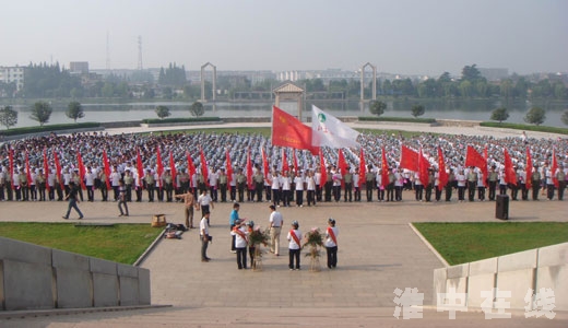 7点,淮安中学高一新生在教官和老师的带领下,排着整齐的队伍,高举校旗、团旗、班旗,怀着无比崇敬的心情,从学校徒步向周恩来纪念馆前进。